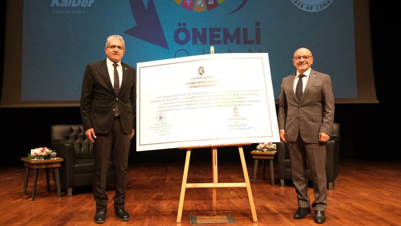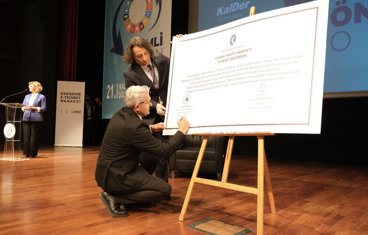 İmza töreninde söz alan Eskişehir OSB Yönetim Kurulu Başkanı Nadir Küpeli, “2019 yılında kurulan okulumuz gerek modern teknik altyapısıyla gerekse de öğrencilerimizin kısa sürede birçok alanda kazandıkları üstün başarılarla hızla ülkemizde marka bir okul olma yolunda emin adımlarla ilerliyor. Marka okul olma yolunda yürütmüş olduğumuzçalışmalar kapsamında Türkiye’nin köklü kuruluşlarındanolan, ülkemizin rekabet gücünün ve refah düzeyinin yükseltilmesine katkıda bulunan KalDer ile böylesi değerli bir çalışmaya imza atmamız bizim için son derece değerli ve kıymetli. Bu imzadan sonra KalDer üyesi olan okulumuz kendisini geliştirme ve marka okul olma yolunda bizler ve okul yöneticilerimizin liderliğinde eğitim öğretime devam edecek. Bu bildirge ile KalDer okulumuzun EFQM Mükemmellik Modeli’ni esas alarak öz değerlendirmeyi sürekli gelişim aracı olarak kullanmasını destekleyecek” ifadelerinde bulundu.