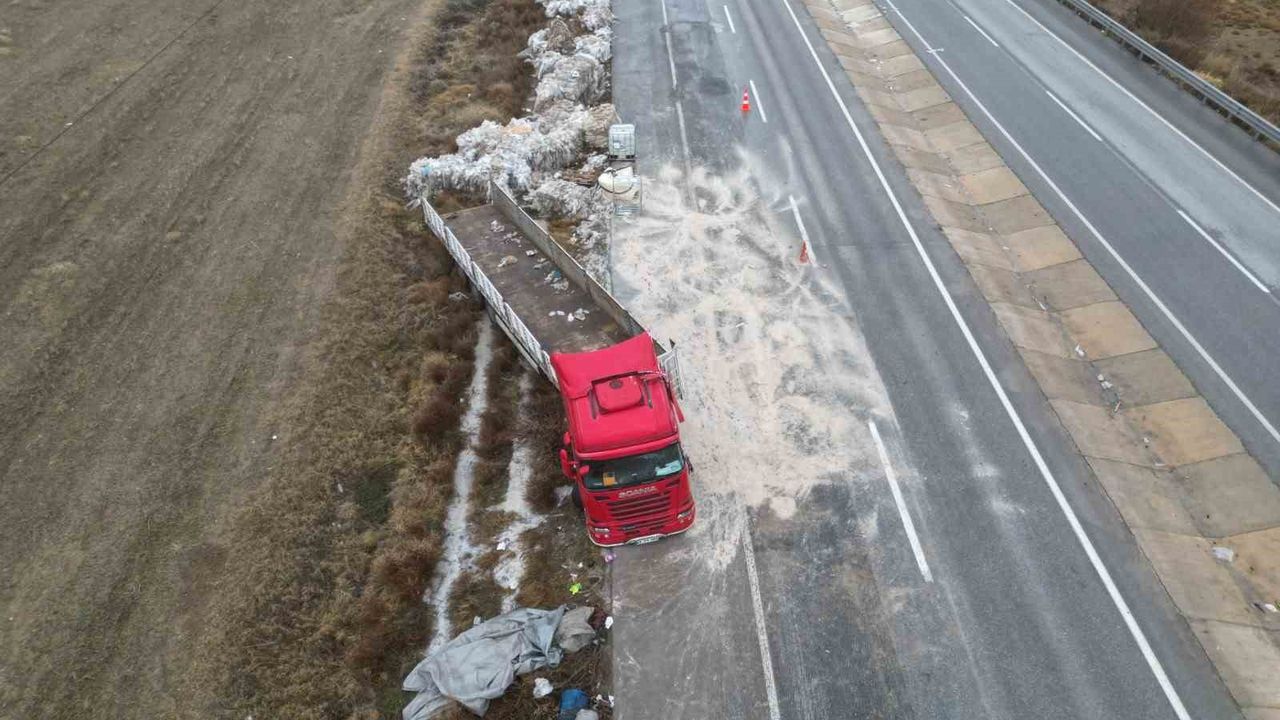 Afyonkarahisar’da kontrolden çıkan geri dönüşüm malzemesi yüklü tır devrildi. Bir kişinin yaralandığı olayda çevreye dağılan tonlarca geri dönüşüm malzemesi ise saatler süren müdahale sonrası toplanabildi.