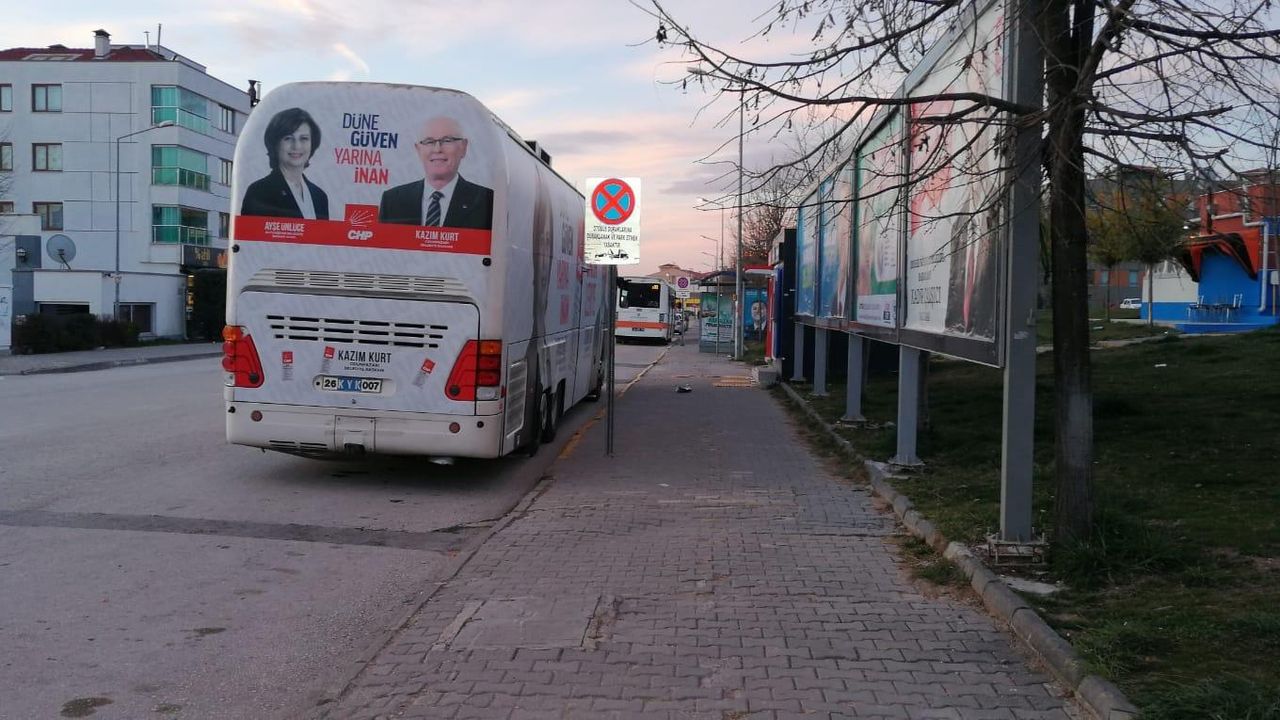 AK Parti Odunpazarı İlçe Başkanı Ümit Sezer, Vadişehir Mahallesi Nilüfer caddesinde Cumhuriyet Halk Partisi Belediye Başkan Adaylarına ait Otobüsün Özkan Alp'in Billboard görsellerini kapatacak şekilde park edilmesine tepki gösterdi.