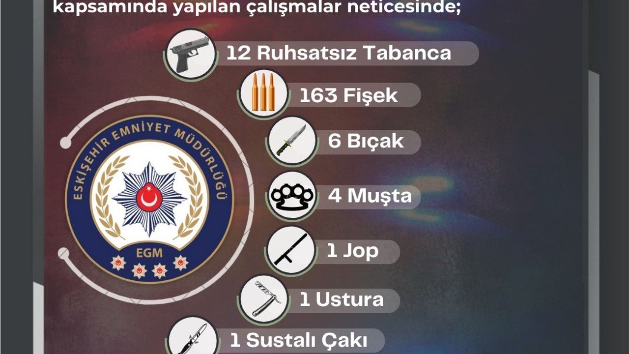 Edinilen bilgilere göre, 30 Ocak - 5 Şubat 2025 tarihleri arasında Eskişehir Emniyet Müdürlüğü ekiplerince halkın huzur ve güvenliğini sağlamak amacıyla çalışma yapıldı. ’Ateşli Silah ve Bıçaklar Hakkındaki Kanun’ ile ’Kabahatler Kanunu’ çerçevesinde yapılan çalışmalarda; 12 ruhsatsız tabanca, 163 fişek, 6 bıçak, 4 muşta, 1 jop, 1 ustura ve 1 sustalı çakı ele geçirildi. Ekiplerin 20 olaya müdahale ettiği çalışmaların sonunda 21 şüpheliye işlem uygulandığı öğrenildi.