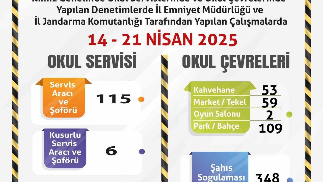 Edinilen bilgilere göre, İl Emniyet Müdürlüğü ve İl Jandarma Komutanlığı ekiplerince okul servisleri ve okul çevrelerine yönelik yapılan denetimler sürüyor. Bu çerçevede kent genelinde 14-21 Nisan tarihleri arasında gerçekleştirilen çalışmalarda, kontrol edilen 115 servis aracından 6’sının kusurlu olduğu belirlendi. Ekiplerce, okul çevrelerinde bulunan 53 kahvehane, 59 market/tekel, 2 oyun salonu ve 109 park/bahçe kontrol edildi. Ayrıca, 348 şahsa kimlik sorgusu yapıldı.
