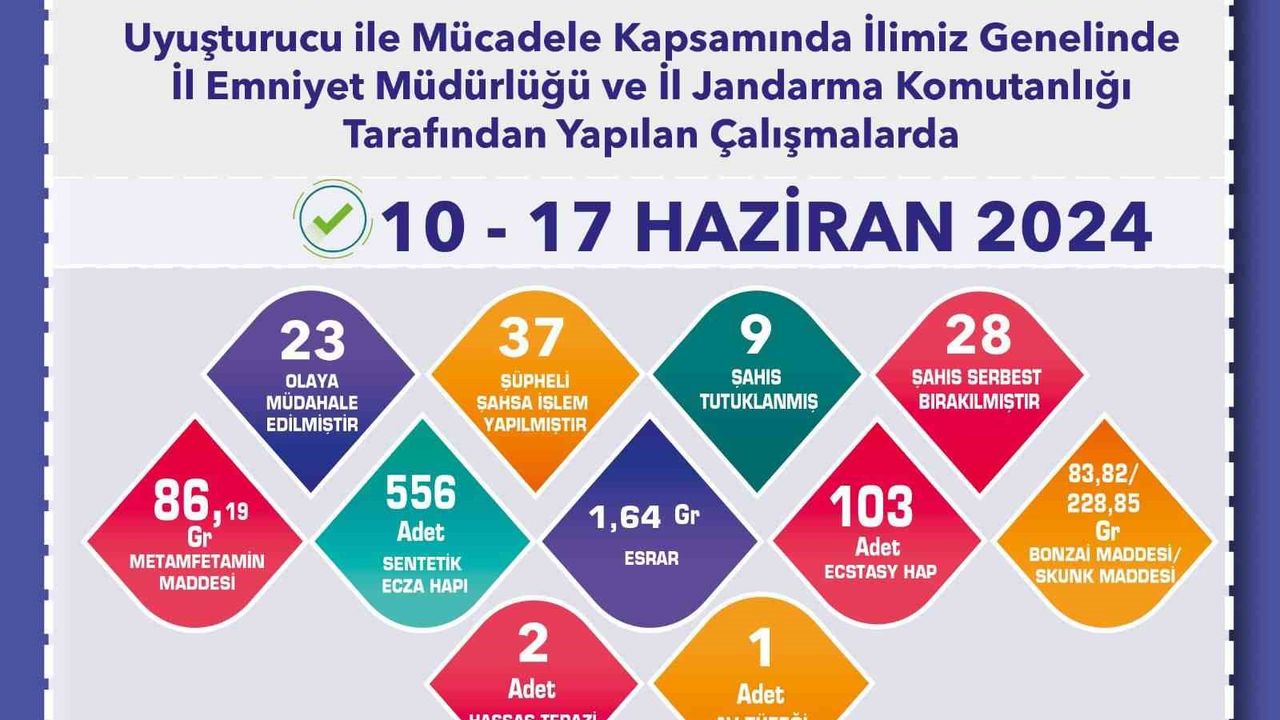 Edinilen bilgiye göre, uyuşturucu ile mücadele çerçevesinde İl Emniyet Müdürlüğü ve İl Jandarma Komutanlığı ekipleri tarafından çalışmalar yapıldı. Kent genelinde 10 ila 17 Haziran tarihleri arasında gerçekleştirilen çalışmalarda; 23 olaya müdahale edilirken, 37 şüpheli şahsa işlem yapıldı, 9 şahıs tutuklandı ve 28 şahıs serbest bırakıldı. Ekiplerce yapılan çalışmalarda yapılan aramalar sonucu, 86,19 gram metamfetamin, 556 adet sentetik ecza hapı, 1,64 gram esrar, 103 adet ecstasy hap, 83,82 gram bonzai, 229,85 gram skunk, 2 adet hassas terazi ve 1 adet de av tüfeği ele geçirildi.