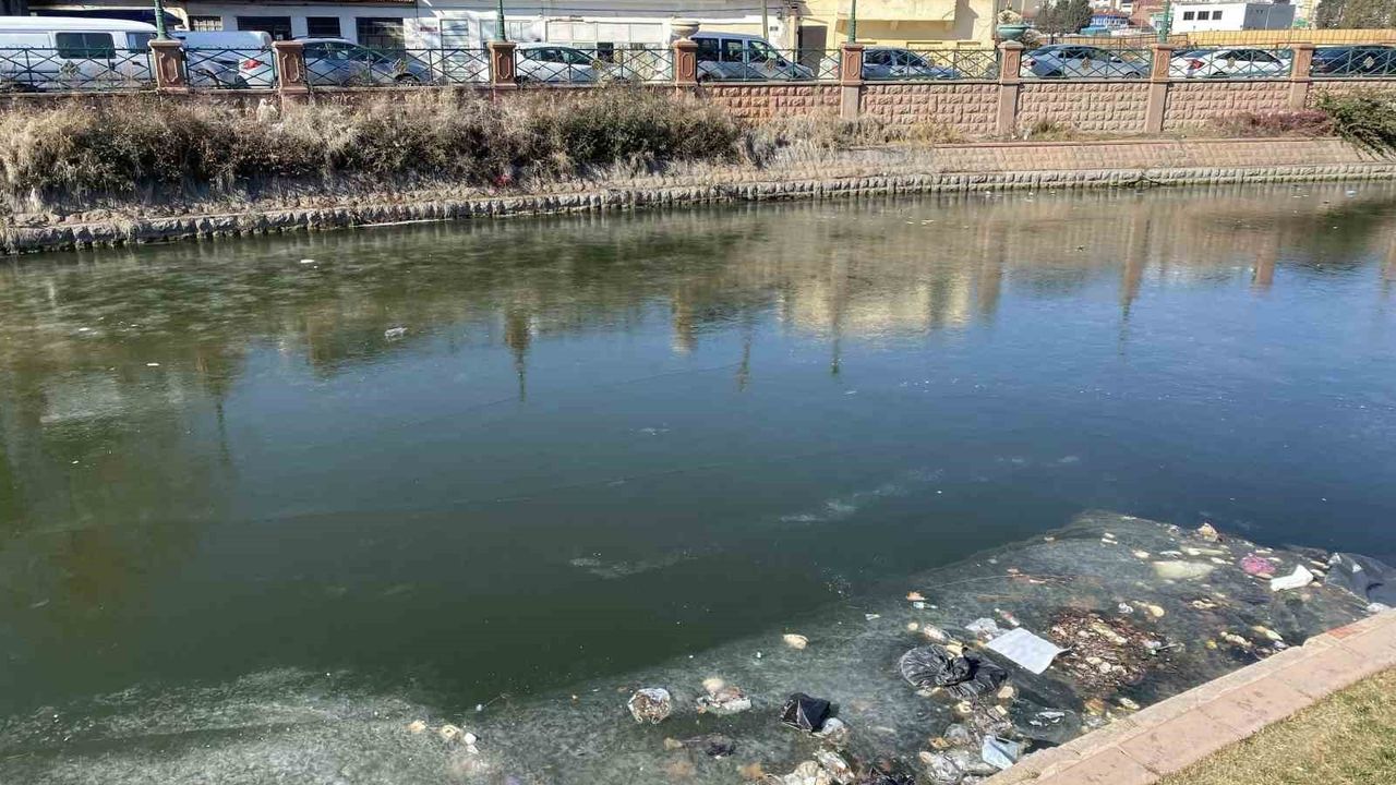 Eskişehir’de, duyarsız vatandaşların Porsuk Çayı’a attığı çöplerin, kıyıdaki buz parçası içindeki görüntüsü çirkin bir manzara oluşturdu.