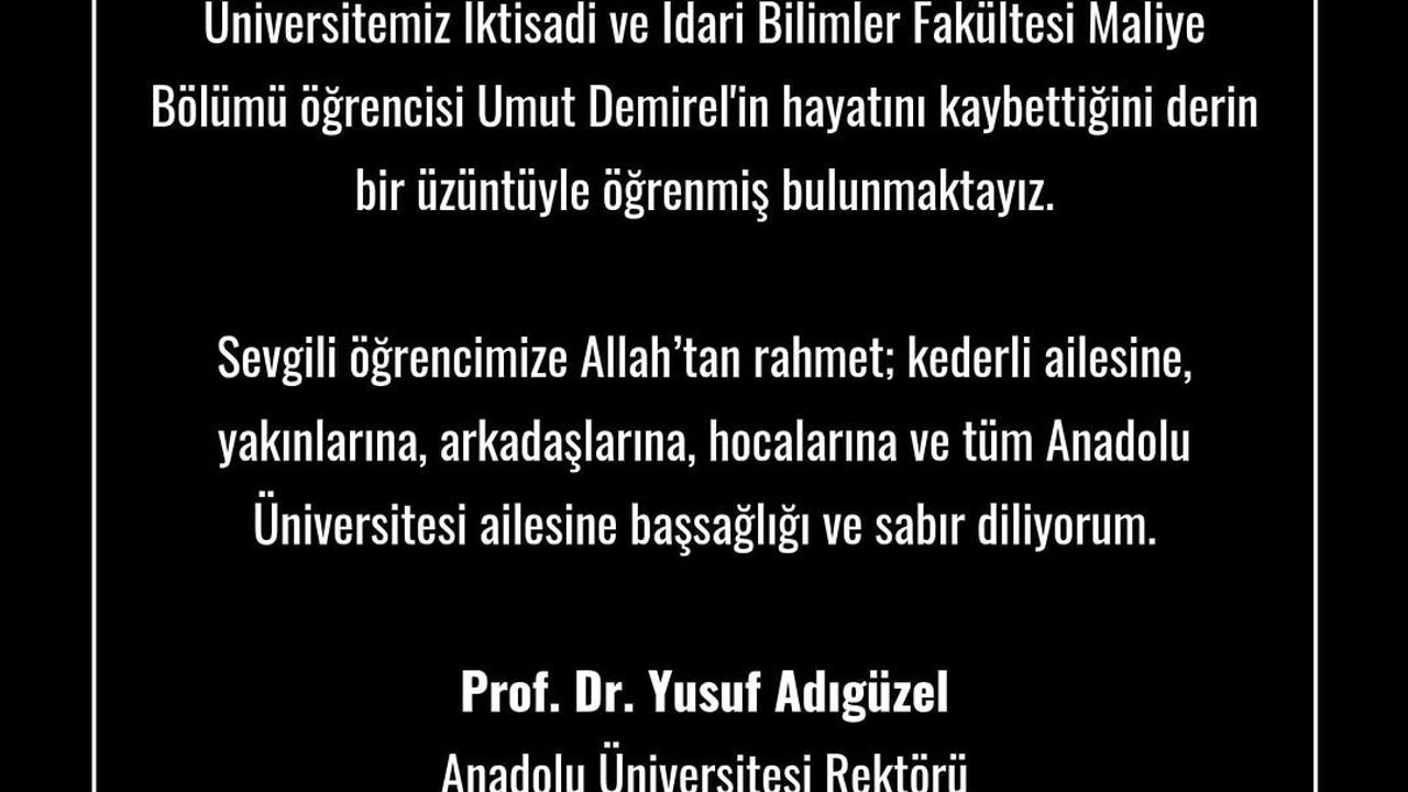 nadolu Üniversitesi Rektörü Prof. Dr. Yusuf Adıgüzel ,vefat eden öğrencisi için bir taziye mesaj yayımladı. Anadolu Üniversitesi Rektörü Prof. Dr. Yusuf Adıgüzel, kalp krizinden dolayı vefat eden öğrencisi Umut Demirel için yayımladığı mesajda, "Üniversitemiz İktisadi ve İdari Bilimler Fakültesi Maliye Bölümü öğrencisi Umut Demirel'in hayatını kaybettiğini derin bir üzüntüyle öğrenmiş bulunmaktayız. Sevgili öğrencimize Allah'tan rahmet; kederli ailesine, yakınlarına, arkadaşlarına, hocalarına ve tüm Anadolu Üniversitesi ailesine başsağlığı ve sabır diliyorum" dedi.