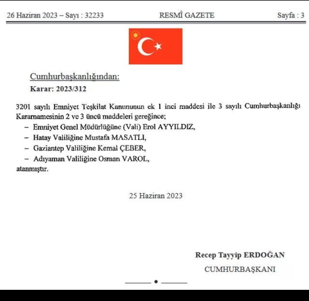 Cumhurbaşkanı Erdoğan'ın imzasıyla gerçekleşen atamalar Resmi Gazete'de yayımlandı. 3201 sayılı Emniyet Teşkilat Kanununun ek 1'inci maddesi ile 3 sayılı Cumhurbaşkanlığı Kararnamesinin 2 ve 3'üncü maddeleri gereğince; Emniyet Genel Müdürlüğü'ne Eskişehir Valisi Erol Ayyıldız atandı. Atama kararlarına göre deprem bölgesinde bulunan Hatay Valiliğine Mustafa Masatlı, Gaziantep Valiliğine Kemal Çeber ve Adıyaman Valiliğine Osman Varol atandı.