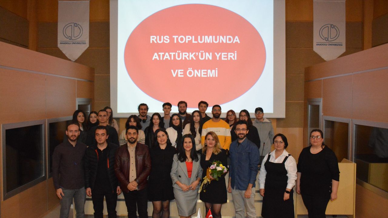 Anadolu Üniversitesi Edebiyat Fakültesi Rus Dili ve Edebiyatı Bölümü tarafından 10 Kasım Atatürk’ü Anma Programı kapsamında, “Rus Toplumunda Atatürk’ün Yeri” başlıklı seminer Edebiyat Fakültesi Taciser Tüfekçi Sivas Konferans Salonu’nda düzenlendi. Yozgat Bozok Üniversitesi Dr. Öğr. Üyesi Esra Elmacıoğlu’nun konuşmacı olarak katıldığı seminere, Anadolu Üniversitesi Edebiyat Fakültesi Dekan Yardımcısı Prof. Dr. B. Yelda Uçkan ve Rus Dili ve Edebiyatı Bölüm Başkanı Prof. Dr. Makbule Sabziyeva başta olmak üzere çok sayıda kişi katılım sağladı.