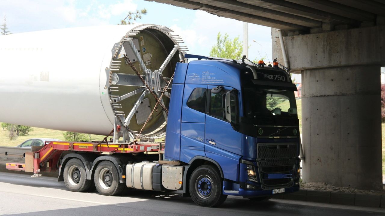 Eskişehir'de taşınan rüzgâr türbinin kanadı, üst geçide sıkıştı.
