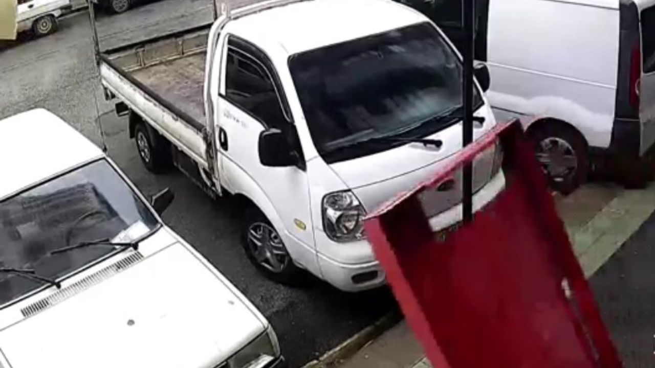 Buzdolabı kapağının devrilerek otomobile zarar verdiği anlar güvenlik kamerasına yansıdı.
