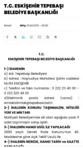 Taşınmaz satışı 22 Nisan 2025 tarihinde saat 10.00 da Tepebaşı Encümen salonunda gerçekleştirilecek.