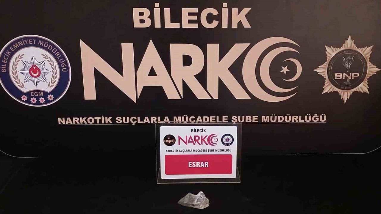 Bilecik’te polis ekiplerinin şüpheli hareketlerde bulunan bir şahsı, ekiplerin üzerine geldiği görünce elindeki kağıt parçasını yere attı. Ekipler şahsı alırken, yerdeki kağıt parçasının içinden 0,31 gram ağırlığında esrar çıktı. Şüpheli şahıs hakkında NARKO ekiplerince ’TCK 191-kullanmak için uyuşturucu veya uyarıcı madde satın almak, kabul etmek veya bulundurmak’ suçu kapsamında yasal işlem başlatıldığı öğrenildi.