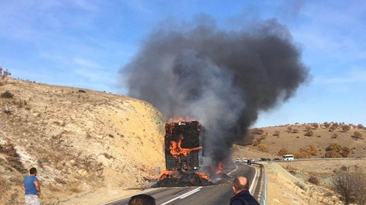 Eskişehir’de seyir halindeki saman yüklü tır alev alev yandı.
