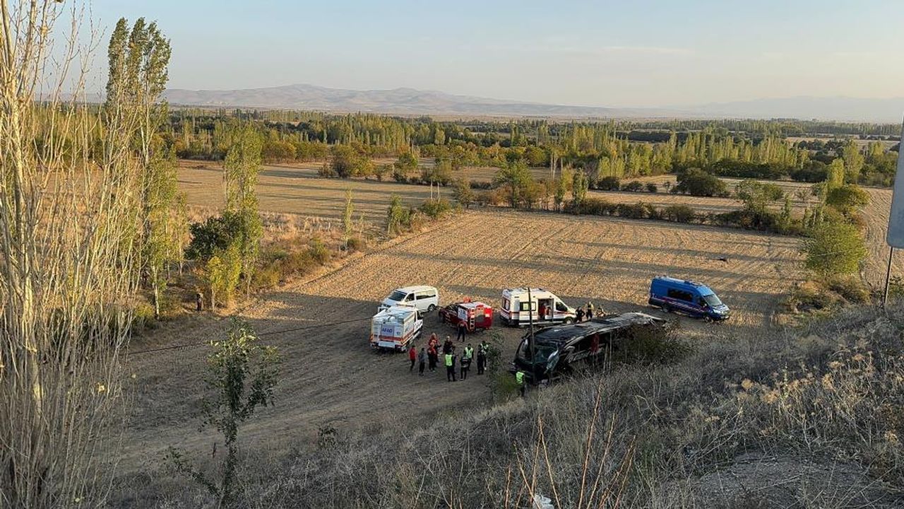 Afyonkarahisar'da kontrolden çıkarak bariyerleri aşıp ardından yaklaşık 50 metre yükseklikteki şarampolden aşağı yuvarlanan yolcu otobüsünde ilk belirlemelere göre 21 kişi yaralandı.