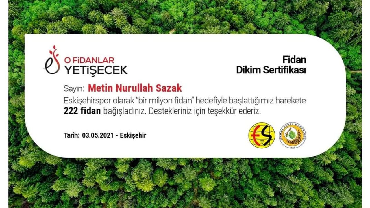 Milliyetçi Hareket Partisi Eskişehir Milletvekili Metin Nurullah Sazak Eskişehirspor’a destek için başlatılan "Bir Milyon Fidan " kampanyasına destek olarak Şehrimizin alan kodu olan 222 rakamı kadar fidan bağışında bulundu.