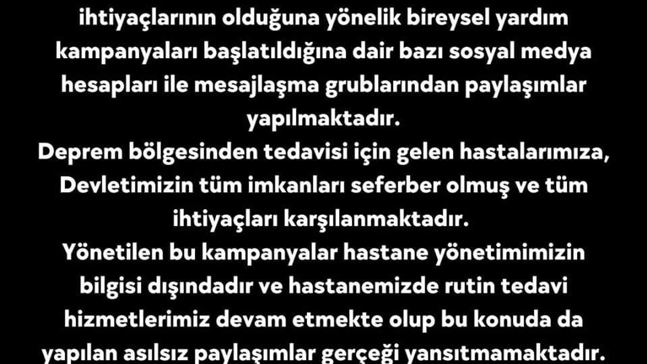Şehir Hastanesi Başhekimliginden yapılan açıklamada , deprem bölgesinden gelen hastalarımızın; mama, bez, pijama gibi ihtiyaçlarının olduğuna yönelik bireysel yardım kampanyaları başlatıldığına dair bazı sosyal medya hesapları ile mesajlaşma grublarından paylaşımlar yapılmaktadır