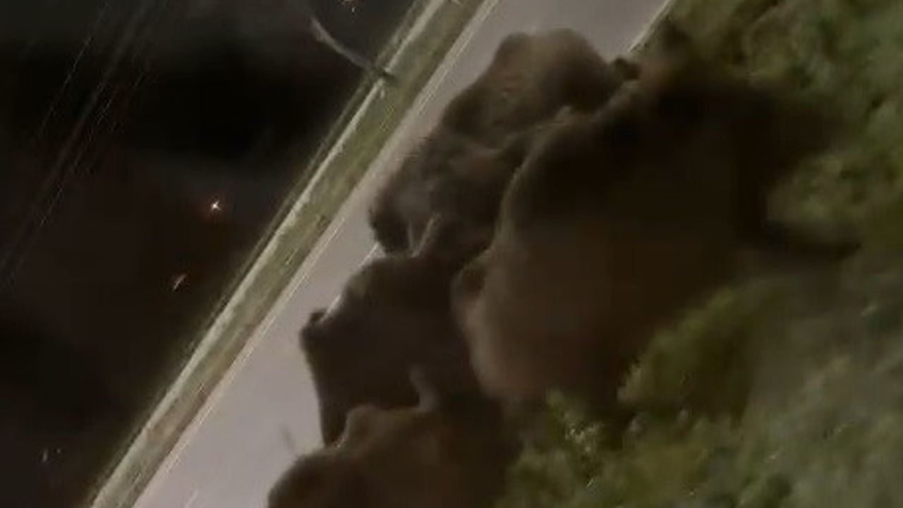 Afyonkarahisar’ın Bolvadin ilçesinde gece saatlerinde Sanayi Sitesi yakınlarına gelen domuzlar, refüjde görüntülendi. Yoldan geçen bir araç içerisinden vatandaşın çektiği videoda domuzlar net bir şekilde görüldü.