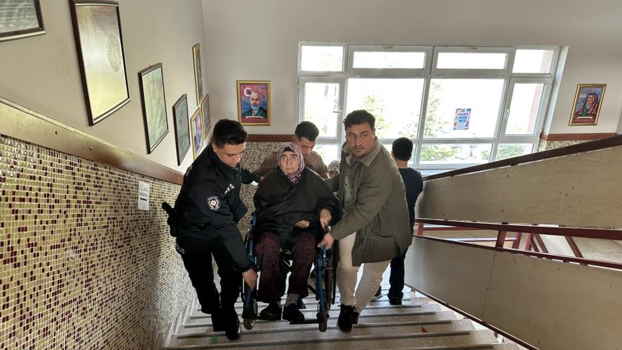 Kıbrıs şehidinin eşi 72 yaşındaki yürüme engeli bulunan Hanım Tekin, Kolluk kuvvetleri yardımıyla sandık başına taşındı.