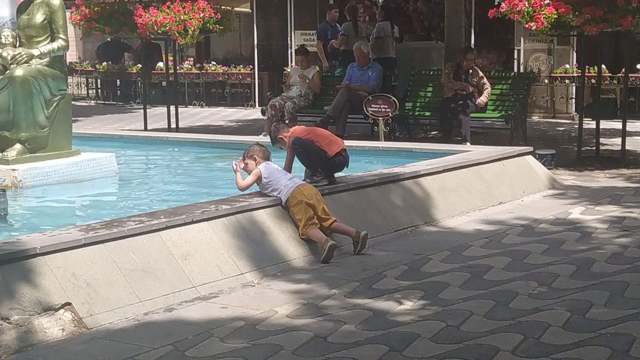 Eskişehir’de hava sıcaklıklarının mevsim normallerinin üzerinde seyretmesi vatandaşlara zor anlar yaşatırken, küçük çocuklar çareyi süs havuzunda serinlemekte buldu.
