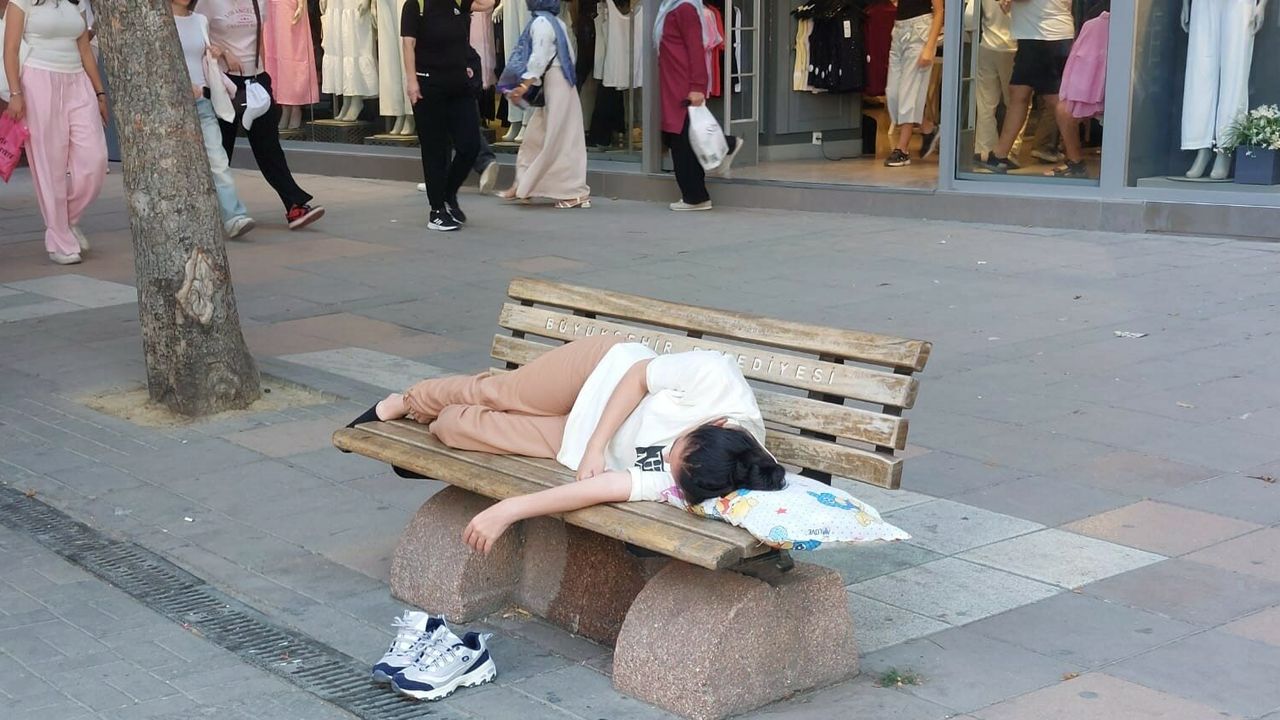 Eskişehir'de sıcaktan bunalan bir gencin şehrin en işlek caddesi üzerindeki bir bankta uzanıp uyuması ilginç bir görüntü oluşturdu.