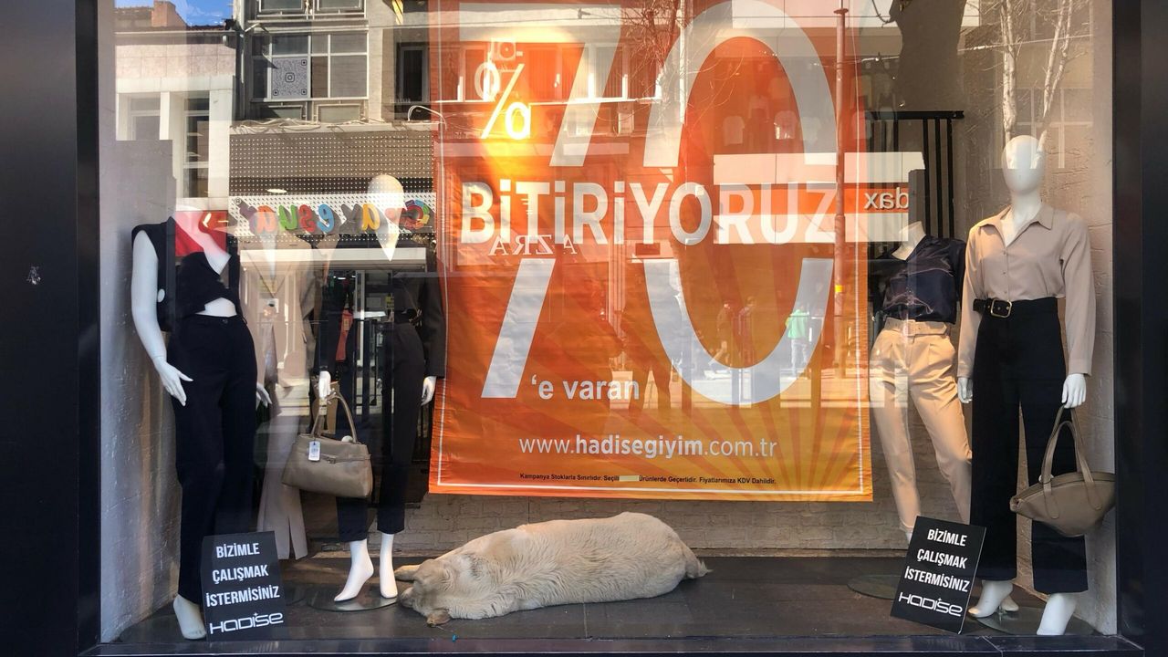 Kent genelinde sıcak havalar etkisini göstermeye başladı. Yüksek hararet vatandaşların bunalmasına yol açarken, sokak hayvanları da bu durumdan korunacak yer arıyorlar. Yüksek sıcaklıklardan etkilenen köpek ise, serinleyebilmek için bir mağazanın vitrinine sığındı. Vitrinde uyuyan hayvan, mağazanın önünden geçen vatandaşın ilgisini topladı.