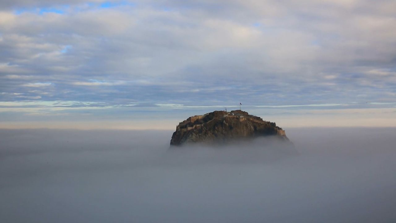 Afyonkarahisar’da sis bulutu altındaki tarihi Karahisar Kalesi seyri doyumsuz görüntü oluşturdu.