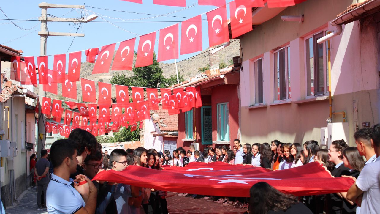 Anadolu’daki ilk ve tek Bakanlar Kurulu toplantısının yapıldığı Zaimağa Konağı’nda başlayan program, Kurtuluş Savaşı Dönemi’nitemsilen Mercedes markalı aracın öncülüğünde, 100 metrelik Türk bayrağı eşliğindeki kortej ile devam etti. Dev Türk bayrağını taşıyan liseli gençlere, kendi elindeki Türk bayrağı ile eşlik eden yaşlı bir kadın ise “ Vatanımız yaşasın, gençler bu vatan sizlere emanet” dedi. Türk bayraklarını heyecanla sallayarak korteje katılan minikler ise adeta “Ülkemizin geleceği bizleriz. Bu vatan atalarımızın emanetidir, emin ellerdedir.” mesajını verdi.