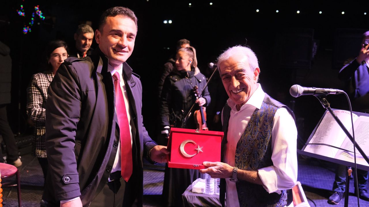 Başkan Dökmeci Sivrihisar’da sahne alan ünlü sanatçı Edip Akbayram’a günün anısına Medeniyetler şehri Sivrihisar’ın simgesi olan Nasreddin Hoca heykeli, filografiden özel olarak yapılan Türk Bayrağı ve çiçek takdim etti.