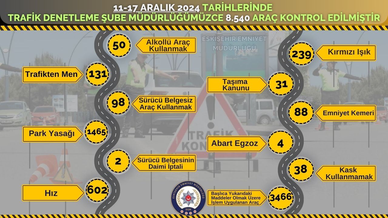 Edinilen bilgilere göre, Eskişehir İl Emniyet Müdürlüğü'ne bağlı Trafik Denetleme Şube Müdürlüğü ekiplerince 11-17 Aralık 2024 tarihleri arasında çalışma yapıldı.