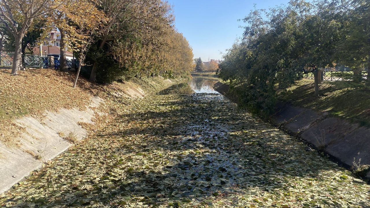 Odunpazarı ilçesi Orhangazi Mahallesi’nde bulunan Porsuk Çayı’nın bir kolunun üzeri, sonbaharda sararan ve dökülen yapraklarla kaplandı. Yoğun yapraklardan dolayı su yüzeyi görünmezken, oluşan manzara dikkat çekti.
