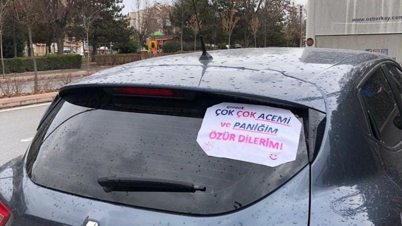 Yazıda, “Çok çok acemi ve paniğim özür dilerim!” ifadeleri ve gülücük yer aldı. Acemiliğini samimi bir şekilde anlatan vatandaş, başta sürücüler olmak üzere görenlerin yüzünü gülümsetti.