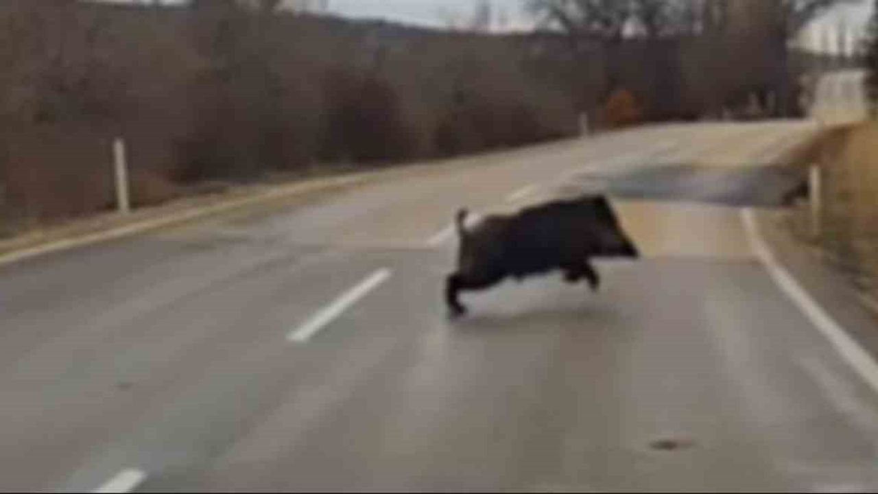 Eskişehir ile Mihalıççık arasında bulunan kara yoluna aniden çıkan yaban domuzunu fark eden sürücü yavaşlayarak hayvana çarpmaktan son anda kurtulurken, yaşananlar araç içi kamerasına yansıdı.