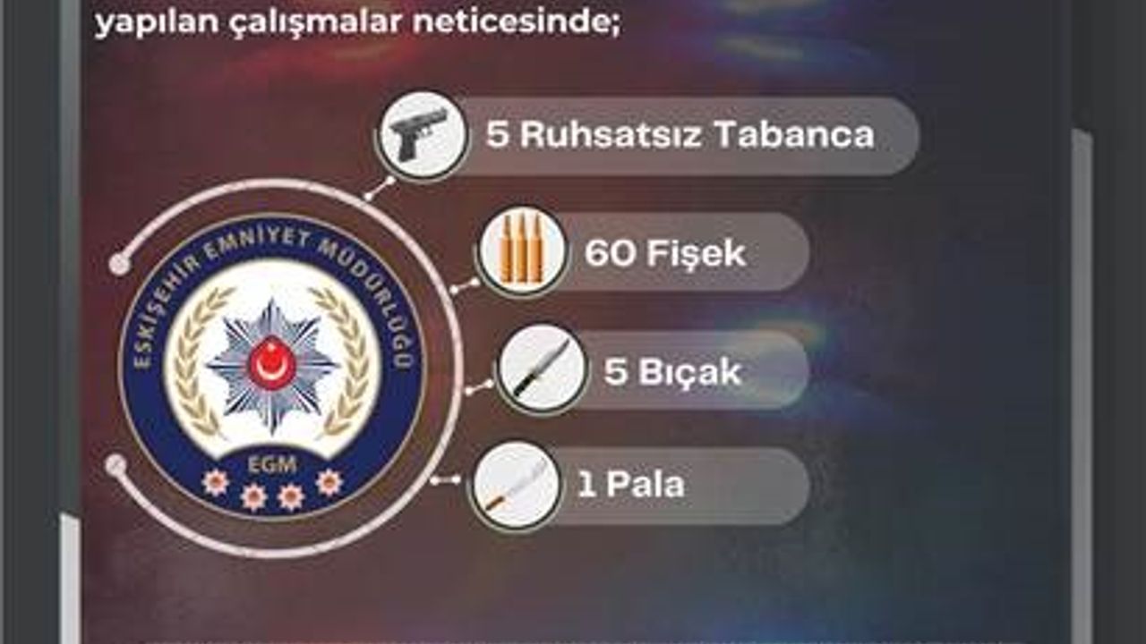 Polisin halkın huzur ve güvenliğini sağlamak amacıyla sürdürdüğü güvenlik çalışmaları sürüyor. Eskişehir Emniyet Müdürlüğü'nce yapılan açıklamaya göre, 9-15 Ocak tarihlerinde Ateşli Silah ve Bıçaklar Hakkındaki Kanun ve Kabahatler Kanunu kapsamında yapılan çalışmalar neticesinde; 5 adet ruhsatsız tabanca, 60 adet fişek, 5 adet bıçak ve 1 adet pala ele geçirildi.