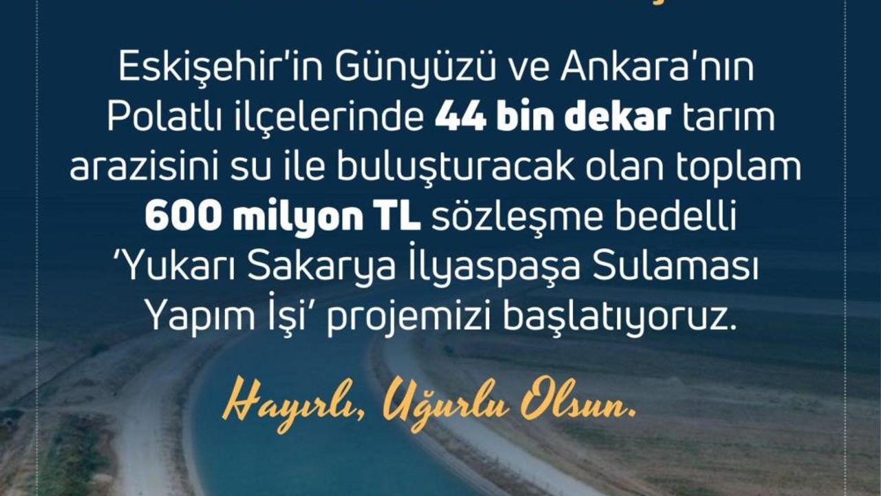 “Yukarı Sakarya İlyaspaşa Sulaması Yapım İşi” isimli projenin başlayacağını duyuran Bakan Kirişçi, bu proje ile Eskişehir’in Günyüzü ve Ankara’nın Polatlı ilçelerinde 44 bin dekar tarım arazisinin su ile buluşacağını açıkladı. Bakan Kirişçi, toplam 600 milyon lira sözleşme bedelli projenin herkese hayırlı olmasını diledi.