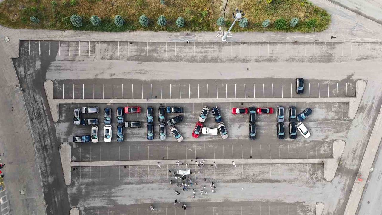 Eskişehir’de kutlanan ‘Türkiye Çevre Haftası’ etkinlikleri çerçevesinde sıfır atık, sıfır karbon ve sıfır emisyona dikkat çeken 33 TOGG kullanıcısı bir araya gelerek, otomobillerle ‘Sıfır Atık’ yazdı.