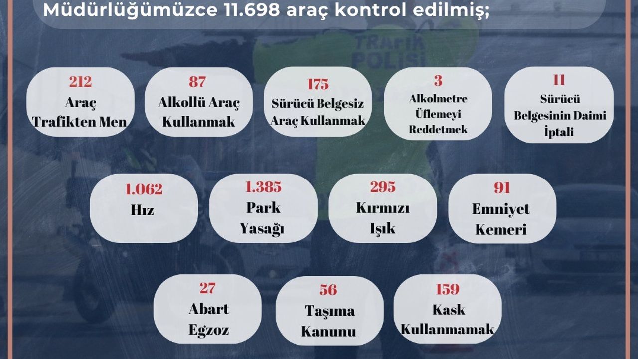 Ekiplerce toplam 11 bin 698 aracın kontrol edildiği çalışmalarda; 87 sürücüye alkollü araç kullanmaktan, 175 kişiye sürücü belgesiz araç kullanmaktan, 3 sürücüye alkolmetreye üflemeyi reddetmekten, bin 62 sürücüye hız yapmaktan, bin 385 sürücüye park yasağını ihlal etmekten, 295 sürücüye kırmızı ışıkta geçmekten, 91 sürücüye emniyet kemeri takmamaktan, 27 sürücüye abart egzozdan, 36 sürücüye taşıma kanunundan ve 159 sürücüye kask kullanmamaktan olmak üzere toplam 3 bin 563 araç ve sürücüye işlem uygulandı. Ayrıca 212 araç trafikten men edilirken, 11 sürücü belgesinin daimi iptali yapıldı.