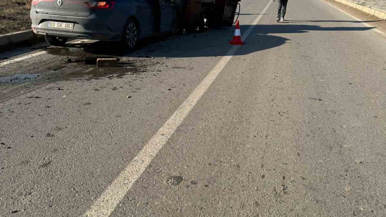 Kaza, kent merkezine bağlı Nuribey beldesi çıkışında meydana geldi. Edinilen bilgilere göre, M.K., yönetimindeki 3 SK 063 plakalı otomobil önünde ilerleyen ve dönüş yapmak isteyen A.G. (69) idaresindeki 03 DF 419 plakalı traktöre çarptı. Çarpmanın etkisi ile savrulan traktör refüje çarpıp ardından ortadan ikiye ayrıldı. Kazada her iki araç sürücüsü ile birlikte B.E.G. (13), Y.E.G. (5) ve Ç.S. (24) yaralandı. Yaralılar kaza sonrası çevredekilerin haber vermesi ile olay yerine gelen ambulanslarla hastaneye kaldırılırken, traktör sürücüsü M.K.’nın durumunun ciddiyetini koruduğu bildirildi.