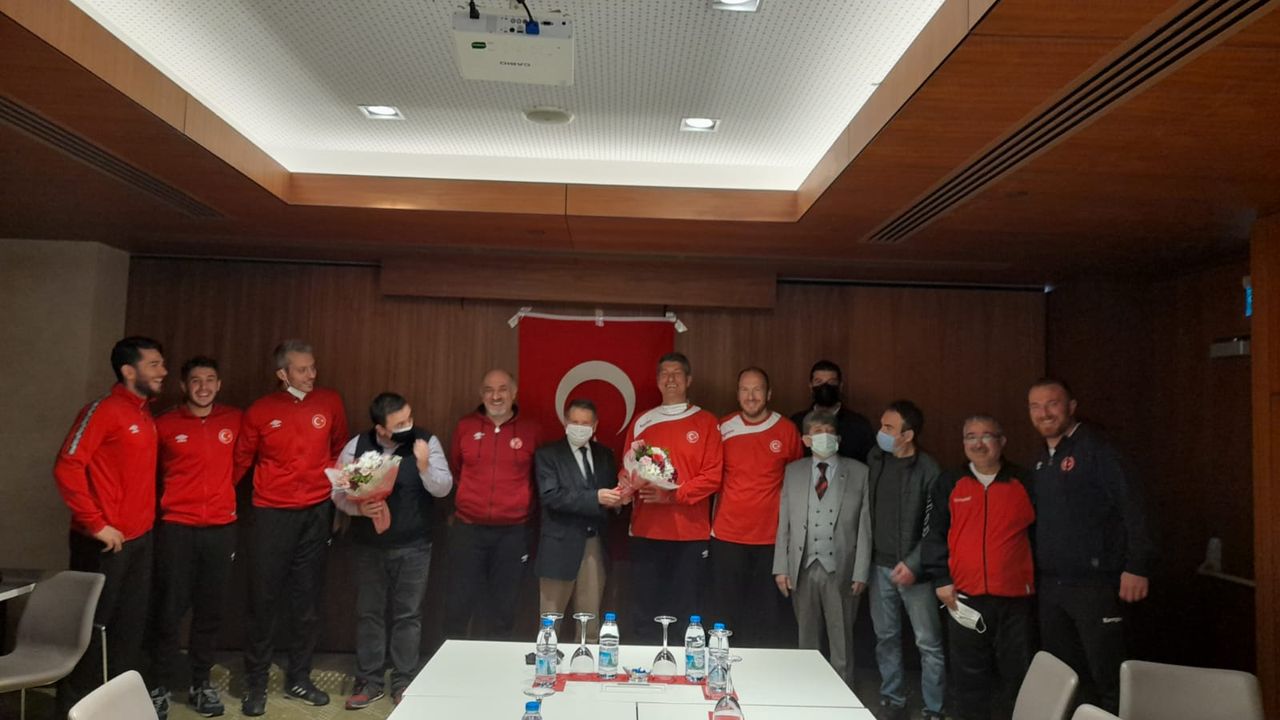 2022 Avrupa Şampiyonası Eleme Müsabakaları kapsamında oynanacak olan Slovenya ve Hollanda müsabakalarına hazırlanan A Erkek Milli Takımı 20 Nisan’dan bu yana Eskişehir’de kamp yapıyor. Bugün Slovenya ile kritik bir maça çıkacak olan Milli takımı, TSYD Eskişehir Şubesi ziyaret etti. Başkan Sadi Seda ve yönetim kurulu üyeleri milli takıma grup maçları için başarılar diledi.