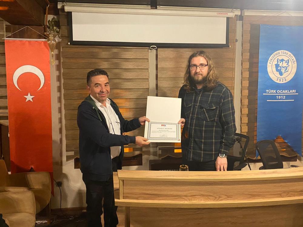 Çok sayıda sorulan soru ve cevaplardan sonra; Eskişehir Türk Ocağı Ocak Başkan Vekili Prof. Dr. Mehmet Topal, konuşmacıya ‘şükran Beratı’ takdim etti.