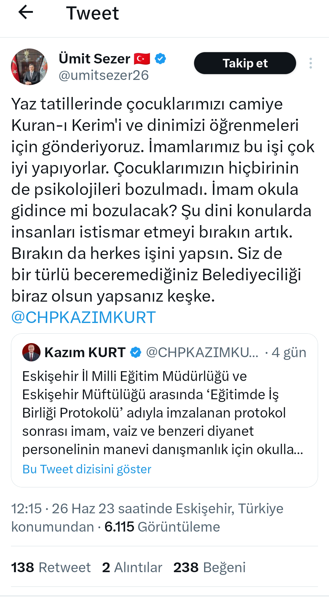 AK Parti İlçe Başkanı Sezer;Yaz tatillerinde çocuklarımızı camiye Kuran-ı Kerim'i ve dinimizi öğrenmeleri için gönderiyoruz. İmamlarımız bu işi çok iyi yapıyorlar. Çocuklarımızın hiçbirinin de psikolojileri bozulmadı. İmam okula gidince mi bozulacak? Şu dini konularda insanları istismar etmeyi bırakın artık. Bırakın da herkes işini yapsın. Siz de bir türlü beceremediğiniz Belediyeciliği biraz olsun yapsanız keşke diyerek düşüncelerini dile getirdi