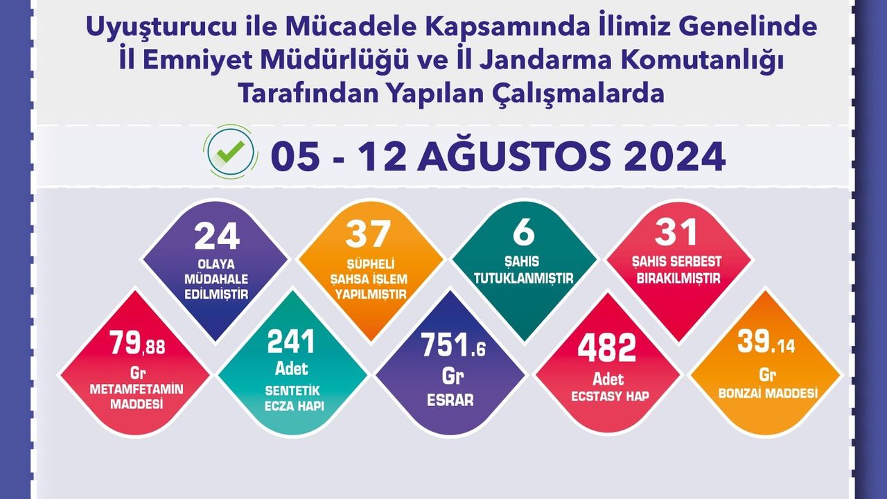 Edinilen bilgiye göre, İl Emniyet Müdürlüğü ve İl Jandarma Komutanlığı ekipleri tarafından uyuşturucu ile mücadele çerçevesinde çalışma yapıldı. Kent genelinde 5-12 Ağustos tarihleri arasında gerçekleştirilen çalışmalarda; 24 olaya müdahale edilip, 36 şahsa işlem yapılıp, 6 şüpheli tutuklandı ve 31 şahıs serbest bırakıldı.