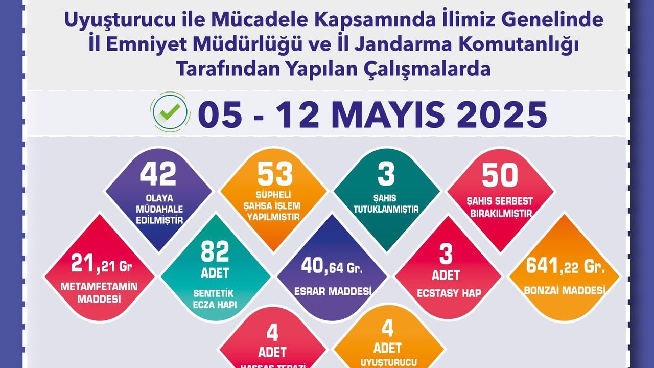 Edinilen bilgilere göre, İl Emniyet Müdürlüğü ve İl Jandarma Komutanlığı ekiplerinin uyuşturucu ile mücadele çalışmaları sürüyor. Bu çerçevede, 5-12 Mayıs 2025 tarihleri arasında kent genelinde çalışma yapıldı. Ekiplerin 42 olaya müdahale ettiği çalışmalar sonucunda 53 şüpheliye işlem yapılırken, 3 şahıs tutuklandı ve 50 şahıs serbest bırakıldı.