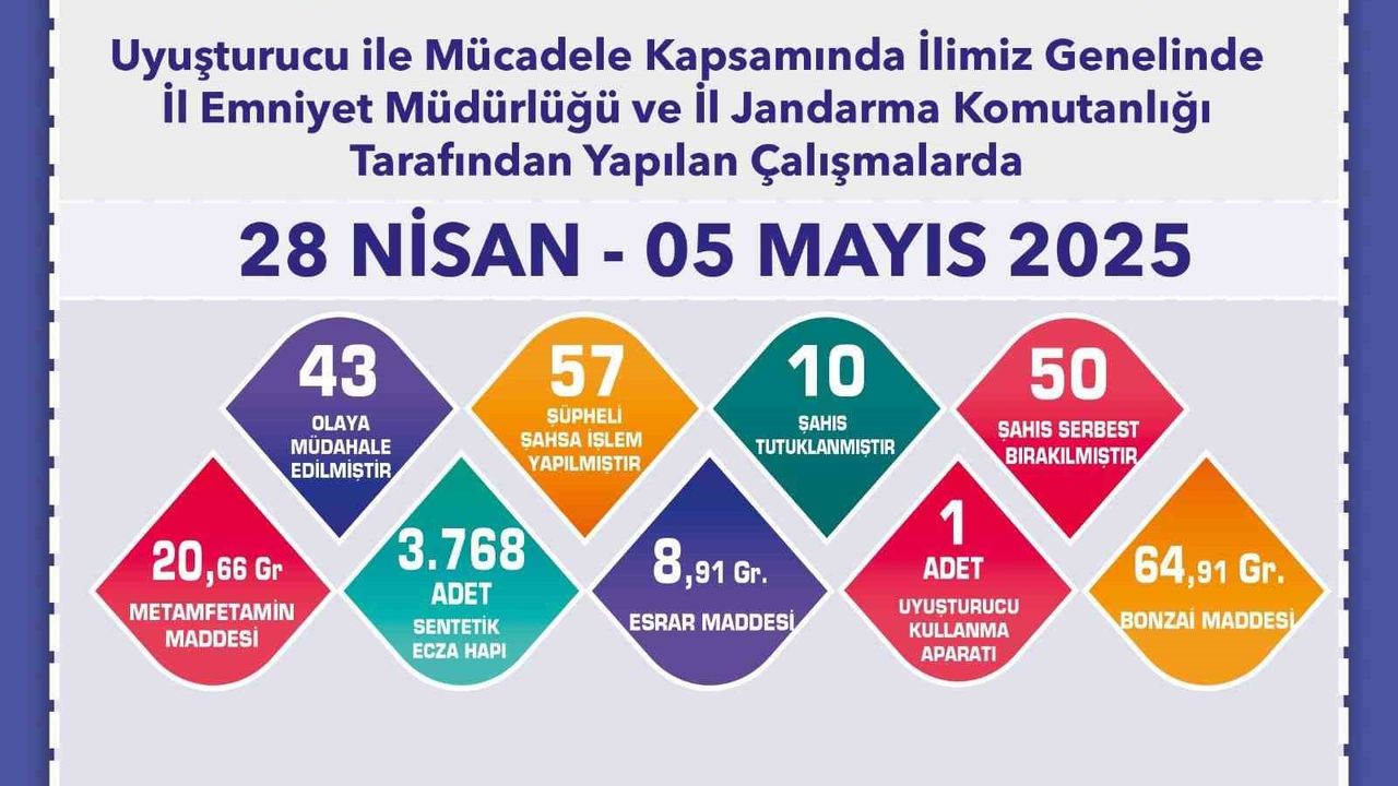 Edinilen bilgilere göre, İl Emniyet Müdürlüğü ve İl Jandarma Komutanlığı ekiplerinin uyuşturucu ile mücadele çalışmaları sürüyor. Bu çerçevede, kent genelinde 28 Nisan - 5 Mayıs tarihleri arasında çalışma yapıldı. Ekiplerin çalışmaları sonucunda 43 olaya müdahale edilirken, 57 şüpheliye işlem yapılıp, 10 şahıs tutuklandı ve 50 şahıs serbest bırakıldı. Ayrıca, 20,66 gram metamfetamin, 3 bin 768 adet sentetik ecza, 8,91 gram esrar, 1 adet uyuşturucu kullanma aparatı ve 64,91 gram bonzai maddesinin ele geçirildiği belirtildi.