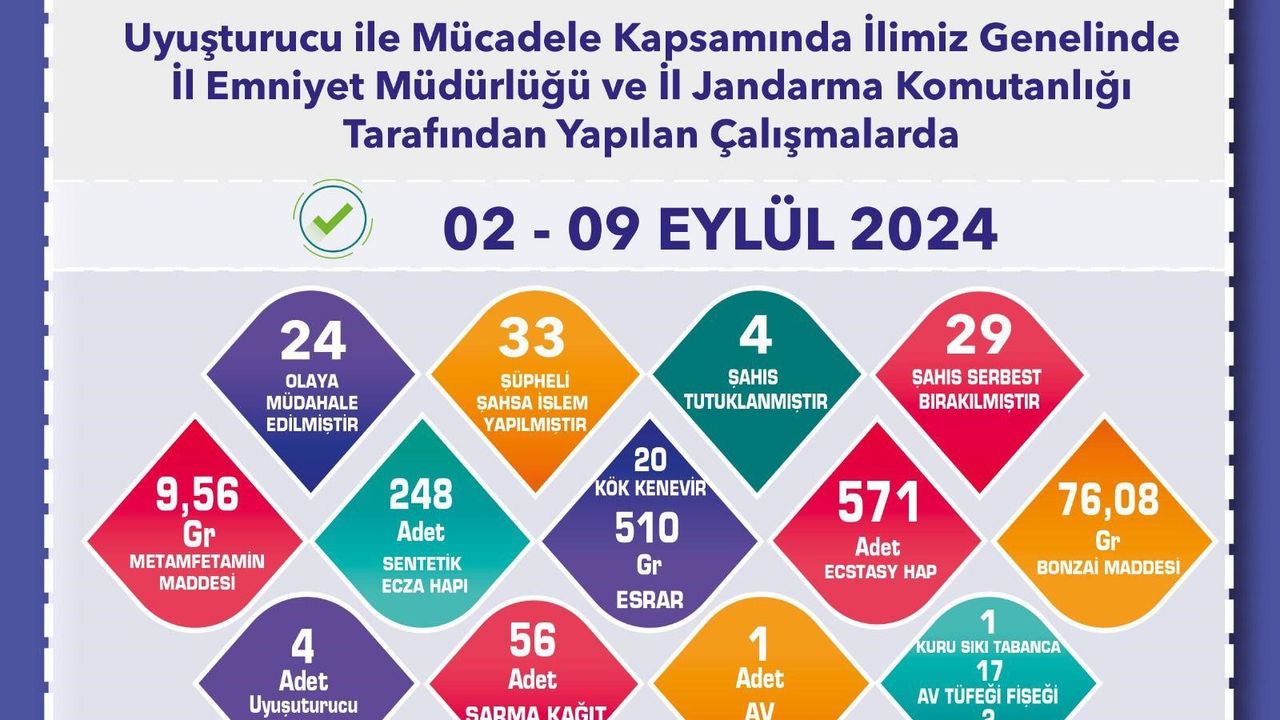 Edinilen bilgiye göre, Eskişehir İl Emniyet Müdürlüğü ve İl Jandarma Komutanlığı'na bağlı ekipler tarafından uyuşturucu ile mücadele çerçevesinde çalışma yapıldı. Kent genelinde 2-9 Eylül tarihleri arasında gerçekleştirilen çalışmalarda 24 olaya müdahale edilirken, 33 şüpheli şahsa işlem yapılıp, 4 şahıs tutuklandı ve 29 şahıs serbest bırakıldı.
