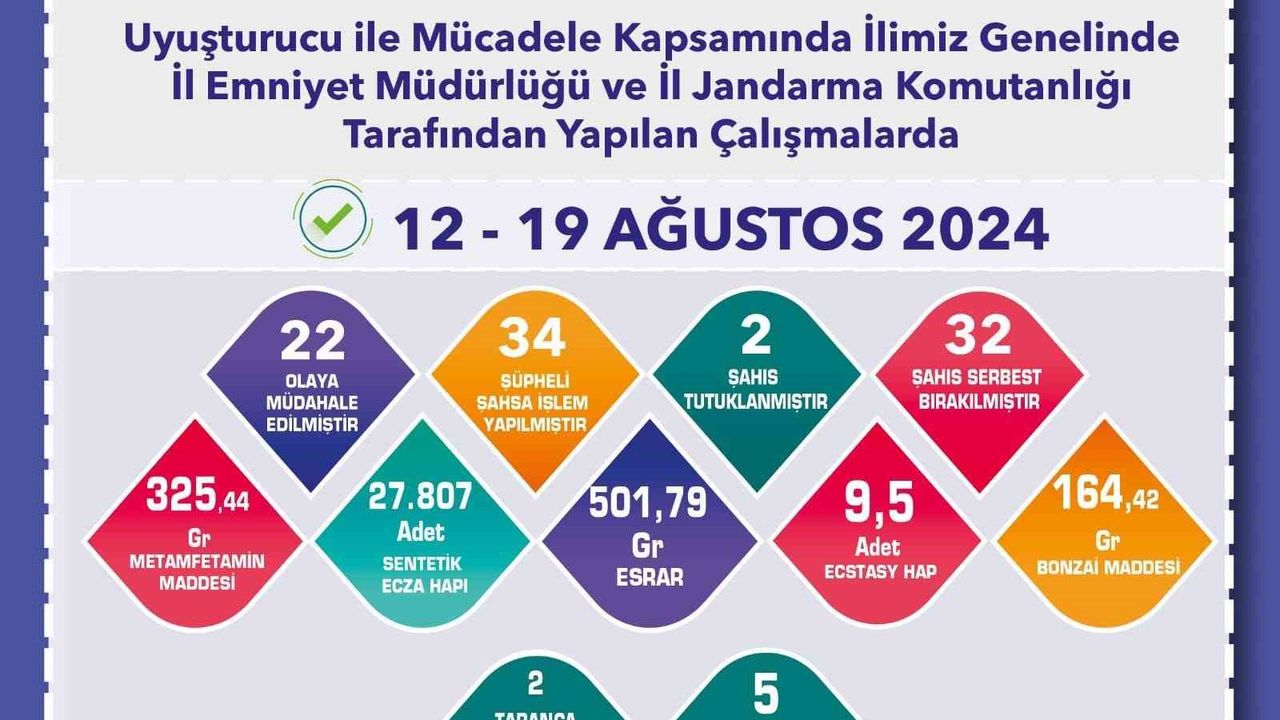 Edinilen bilgiye göre, Eskişehir İl Emniyet Müdürlüğü ve İl Jandarma Komutanlığı tarafından uyuşturucu ile mücadele çerçevesinde çalışma yapıldı. Kent genelinde 12-19 Ağustos tarihleri arasında gerçekleştirilen çalışmalarda; 22 olaya müdahale edilirken, 34 şüpheli şahsa işlem uygulanıp, 2 şahıs tutuklanıp, 32 şahıs ise serbest bırakıldı. Ayrıca 325,44 gram metamfetamin, 27 bin 807 adet sentetik ecza hapı, 501,79 gram esrar, 9,5 adet ecstasy hap, 164,42 gram bonzai, 2 tabanca, 4 tabanca fişeği ve 5 uyuşturucu kullanma aparatının da ele geçirildiği öğrenildi.