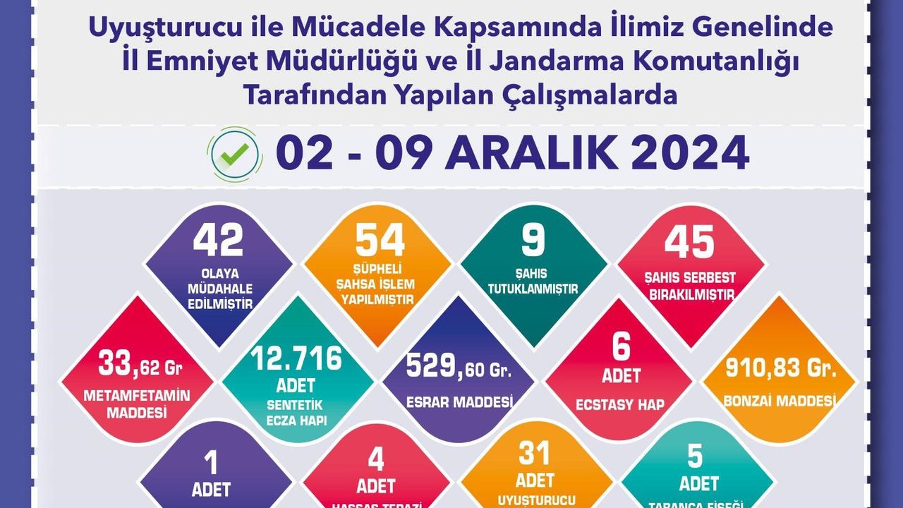 Edinilen bilgilere göre, Eskişehir İl Emniyet Müdürlüğü ve İl Jandarma Komutanlığı ekiplerince uyuşturucu ile mücadele çerçevesinde 2-9 Aralık 2024 tarihleri arasında kent genelinde çalışma yapıldı. Ekiplerin 42 olaya müdahale ettiği çalışmalarda 54 şüpheli şahsa işlem yapılırken, 9 şahıs tutuklandı ve 45 şahıs serbest bırakıldı.