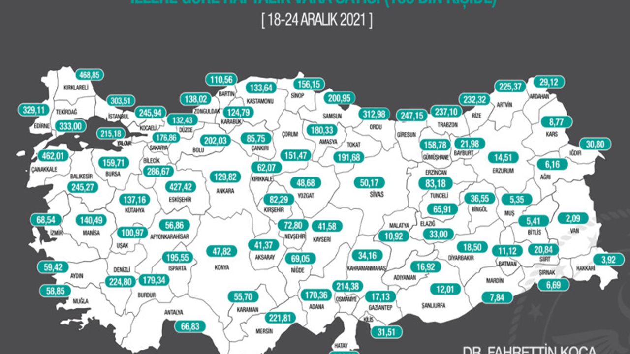 Sağlık Bakanı Fahrettin Koca, 18-24 Aralık tarihleri arasında, 100 bin kişi içinde haftalık toplam yeni koronavirüs vaka sayısı haritasını yayınladı. Haritaya göre, her 100 bin kişide görülen vaka sayısı en çok Kırklareli, Çanakkale ve Eskişehir'de arttı.