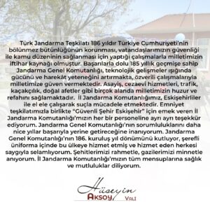 Eskişehir Valisi Hüseyin Aksoy, Türk Jandarma Teşkilatı’nın 186. kuruluş yıl dönümü dolayısıyla bir kutlama mesajı yayımladı.