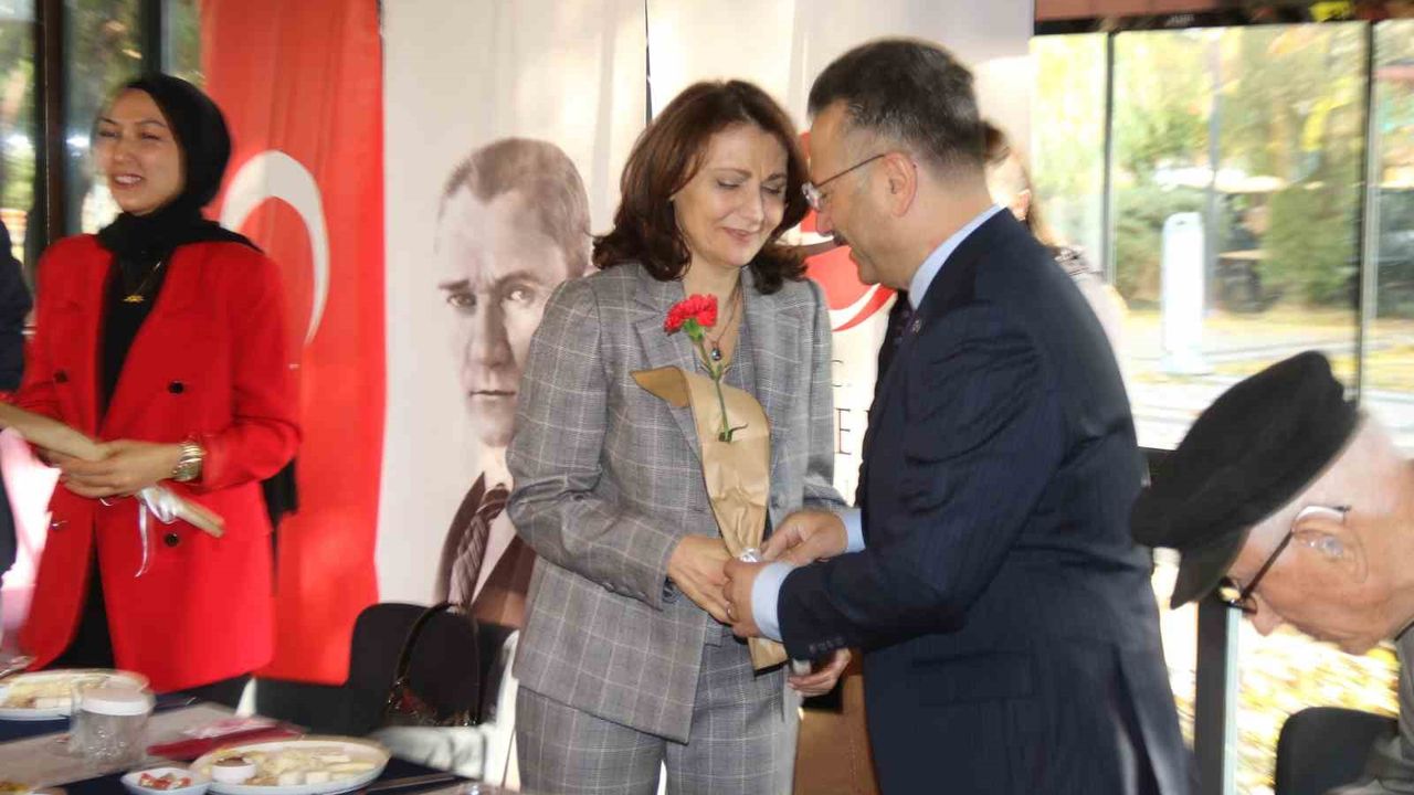 Eskişehir Valisi Hüseyin Aksoy Öğretmenler Günü vesilesiyle öğretmelerle bir araya gelip günlerini kutladı ve onlara çiçek takdim etti. Son olarak resim öğretmeni eşine dönerek gününü kutlayan Vali Aksoy’un samimi tavrı salondakileri gülümsetti.