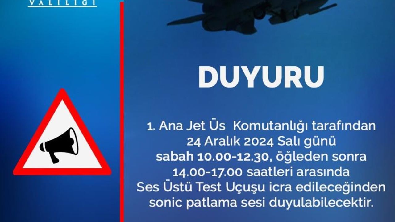 Konuyla ilgili Eskişehir Valiliği’nin resmi sosyal medya hesapları üzerinden duyuru yayımlandı. Paylaşılan bilgiye göre, 1. Ana Jet Üs Komutanlığı tarafından 24 Aralık 2024 tarihinde ’Ses Üstü Test Uçuşu’ gerçekleştirilecek.