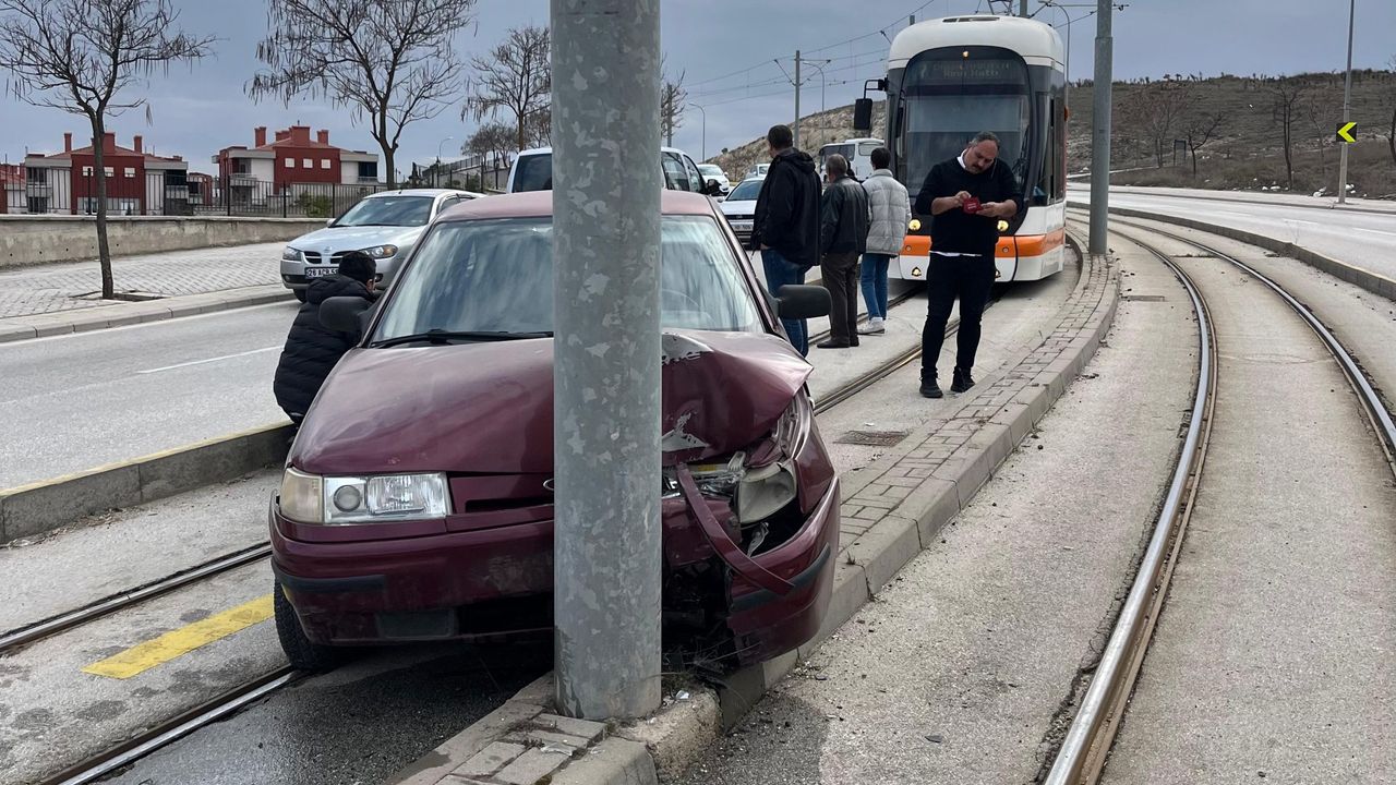 Eskişehir’de virajda sürücüsünün kontrolünden çıkan otomobil, tramvay yoluna girerek kataner direğine çarptı. Kaza nedeniyle tramvay seferlerinde aksama meydana geldi.