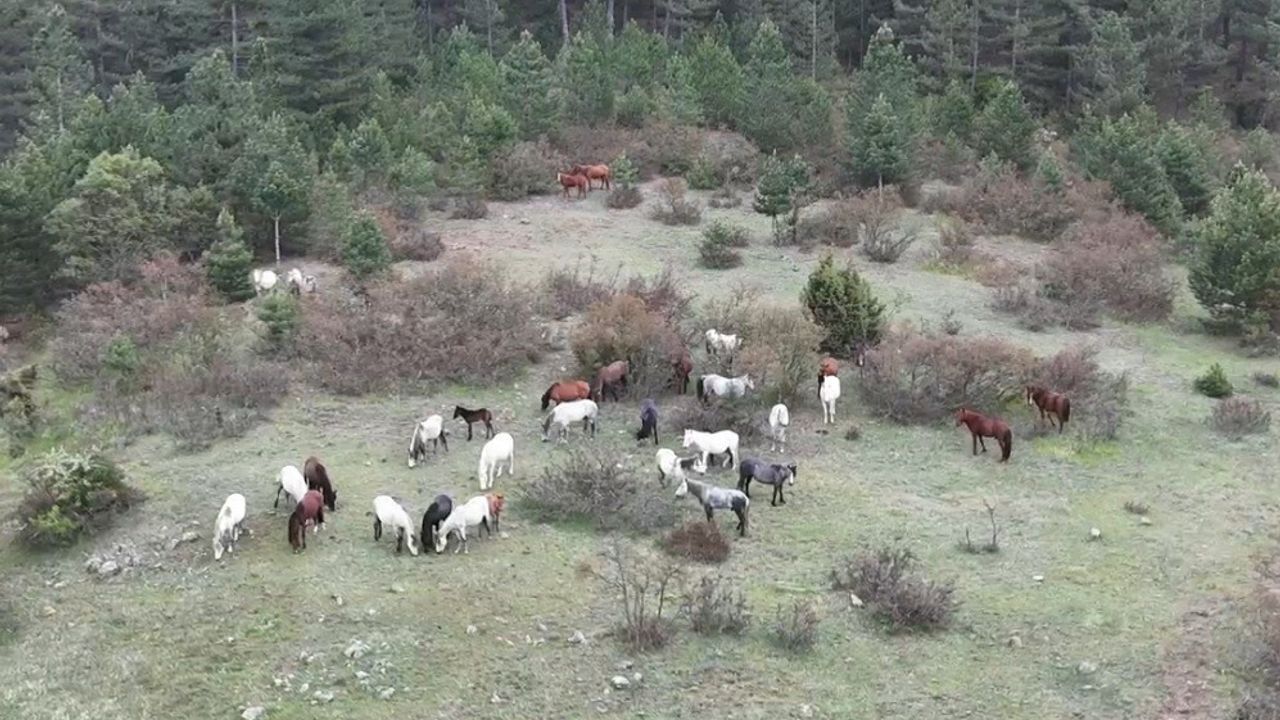 Kütahya’nın Tavşanlı ilçesindeki Şevki Şimşek Yaylacık Ormanı’nda yaşayan atlar, drone ile yavruları ile görüntüledi.